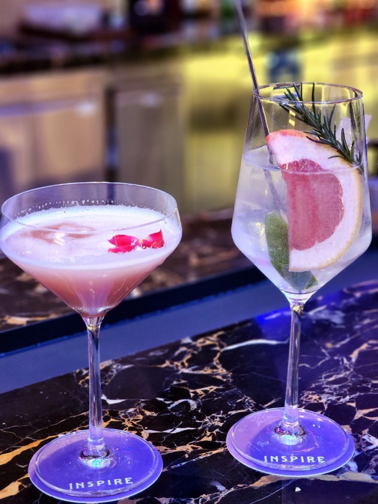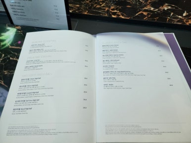 저흰 시그니처 칵테일인 AURORA COCKTAIL에서 오로라 G&T(오른쪽)와 멜로우 사워(왼쪽) 이렇게 두 잔 마셨는데요.