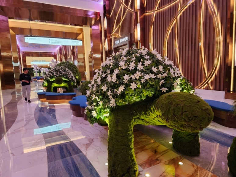 알딸딸 취한 것도 풀 겸 메인 타워 쪽도 한번 걸어봤는데요. 꽃 거북 조형물도 멋지죠? ㅋㅋ
