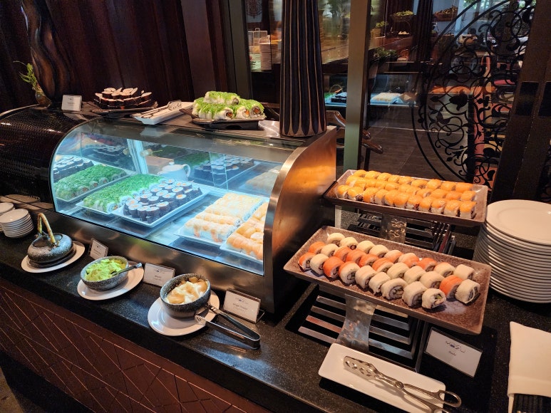 다음 애프터눈 타임에는 과일과 스시가 있더라고요. 스시는 음.. 스시국이 옆에 있어서 그런가 ㅎㅎ 우리나라도 초밥의 경지가 꽤 올라갔잖아요? 그래서 그런지 동남아 오면 스시는 손에 잘 안 가더라고요. 하물며 베지터블 스시라니..ㅎㅎ