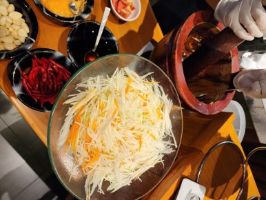 Mozu의 감동 두 번째 포인트! 쏨땀을 그 자리에서 직접 만들어주시더라고요. 기호에 따라 재료를 선택할 수 있어서 더욱 다음에 들었습니다. 우리나라 김치 격인 쏨땀을 식사와 함께하니 더욱 속이 편안했습니다.