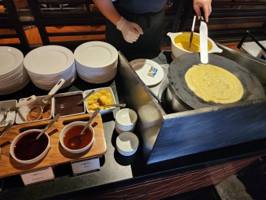 달걀 요리도 다양하게 선택할 수 있고요. 크레페도 바로 만들어주십니다. 조식당에 이렇게 라이브 섹션 많은 곳이 있나요? 크 감동입니다 태국. 감동입니다 르부아