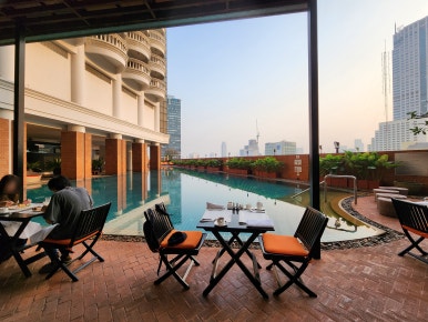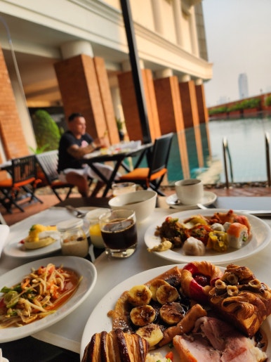 조식당 M 층에는 수영장도 같이 있어서 분위기가 한층 더 살았습니다. 저도 여기 테라스에서 한 끼 했는데요, 바라만 봐도 시원한데 ㅎㅎ 솔직히 10시 넘어가니 좀 더워서 땀이 삐질삐질 나더라고요.